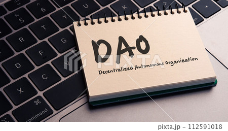 DAOの文字。分散型自律組織。3つの木製ブロックに書かれている。黒い文字。木製テーブルの背景。