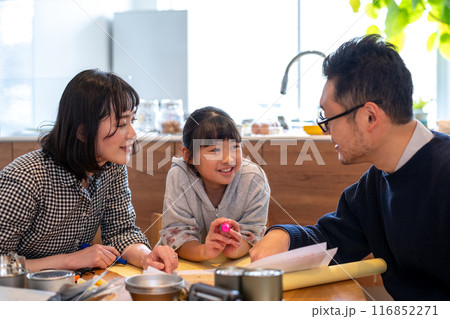 楽しそうな雰囲気で家族防災会議を行っている三人家族