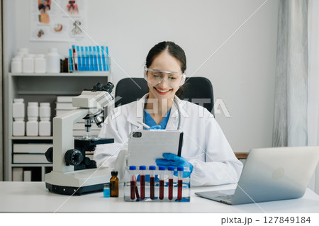 Female Scientist Doctor With Clear Solution Test Tube In Laborat