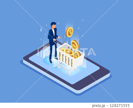 Investment, businessman pushing cart standing on mobile phone to harvest gold coins. Flat isometric vector concept
