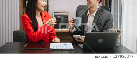 Asian business colleague business presents and explains and using laptop and tablet. Teamwork, financial marketing team, while sitting in modern office