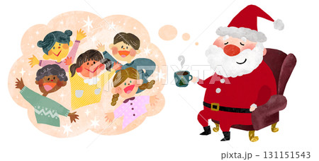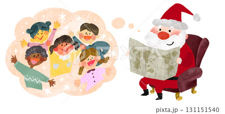 クリスマスを喜ぶ世界の子供たちの事を考えているサンタクロースのクリスマスイラスト