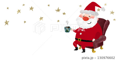 ソファーに座ってくつろぐサンタクロースと星の装飾 クリスマスイラスト