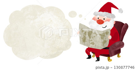地図を見て想像しているサンタクロースと雲型の吹き出しのイラストセット