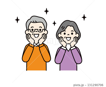 頬に手を当てて感激する、高齢の男性と女性の上半身ベクターイラスト素材_カラー