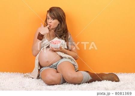 Pregnant woman with donuts on belly. Cravings of desserts and sweets during pregnancy, Girl eating unhealthy pastries on baby bump for gestational diabetes