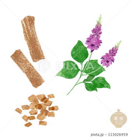 生薬のイラスト/ 葛根の花・根と切片