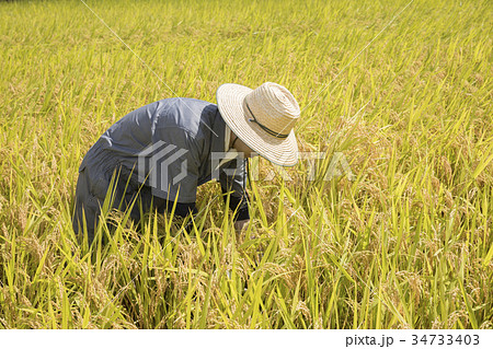 稲刈りイメージ 稲の様子を見る若い男性後ろ姿