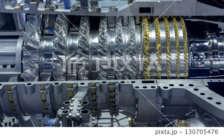 Gas turbine engine with turbine blades, Industrial gas turbine engine, Steel blades of turbine propeller industrial additive technology,