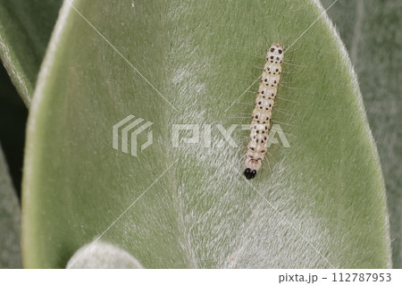 生き物 昆虫 オキナワモンシロモドキ、老齢幼虫。体の点々模様がつながってライン上に