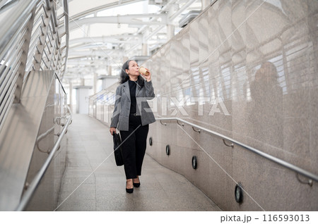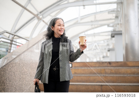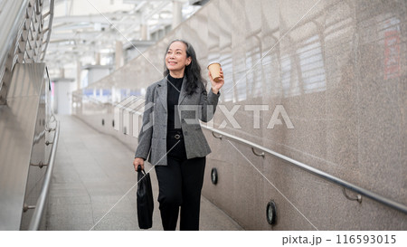 A happy, mature Asian businesswoman is walking with a coffee cup and a briefcase on the skywalk.