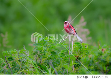 初夏から夏に北海道の草原や原生花園で見られる赤い美しい鳥、ローズピンクのベニマシコ