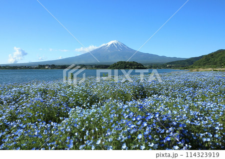 ネモフィラ咲く初夏の河口湖大石公園と富士山 山梨県河口湖町