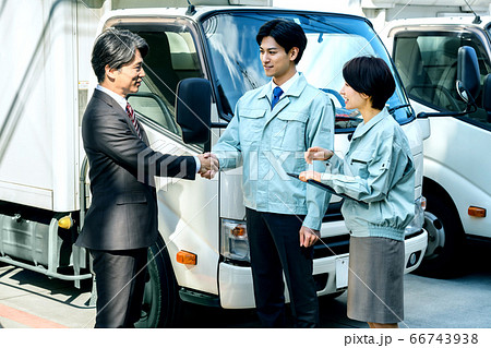 トラックの前で握手するビジネスマン(スーツ 作業員)