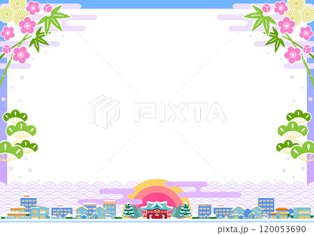 謹賀新年、見事な初日の出に照らされる街並みと松竹梅で飾るベクターフレーム・背景素材