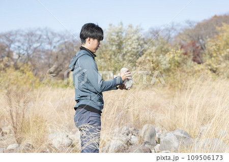 河原でロックバランシングに使えそうな石を探す男性