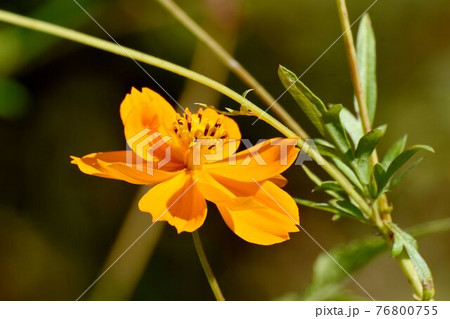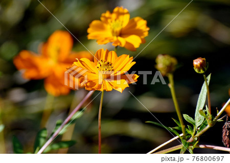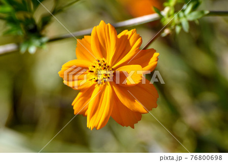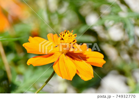 調布市深大寺元町の植物園に咲くオレンジ色のキバナコスモスの花
