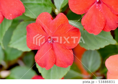 三鷹中原に咲く赤いアフリカホウセンカ(インパチェンス)