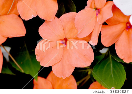 三鷹中原に咲くオレンジ色のアフリカホウセンカ(インパチェンス)