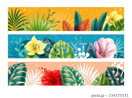 Tropical plants board pages. Horizontal borders, exotic palm leaves, hibiscus and magnolia flowers. Botanical banners design. Natural paradise foliage. Beach trendy background. Vector set