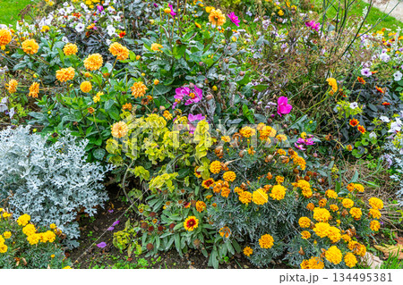 Variety of different types of flowers and plants on a flower bed in the garden. The mix is natural
