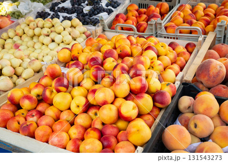 Peaches of different types in boxes at a local market. Colorful display of ripe peaches.
