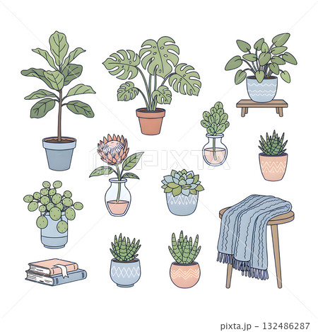 Set of different tropical house plant. Ficus, monstera, protea, pellaea, succulent in various pot, vase. Scandinavian cozy home decor. illustration design.