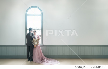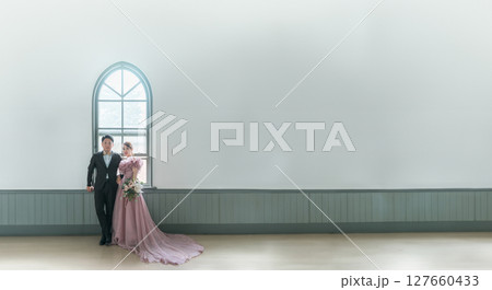 洋館,結婚式場,ピンクのドレスでウェディングフォトを撮るカップル(前撮り)