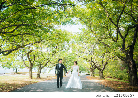 公園の並木道を手を繋いで歩くドレス姿のカップル(ウェディング・ウェディングフォト・新郎新婦)