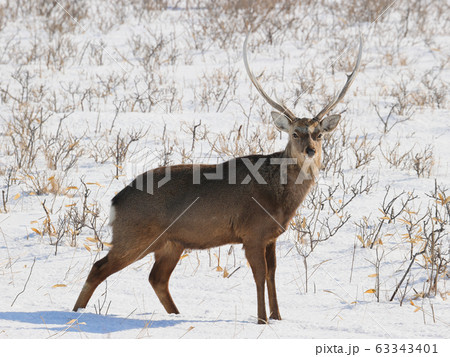 雪原のエゾシカ