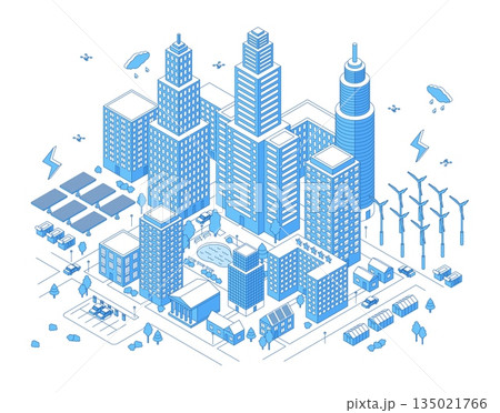 Isometric smart energy city. Modern urban district with skyscrapers, apartment and public buildings. Alternative clean power for life town, nifty vector concept