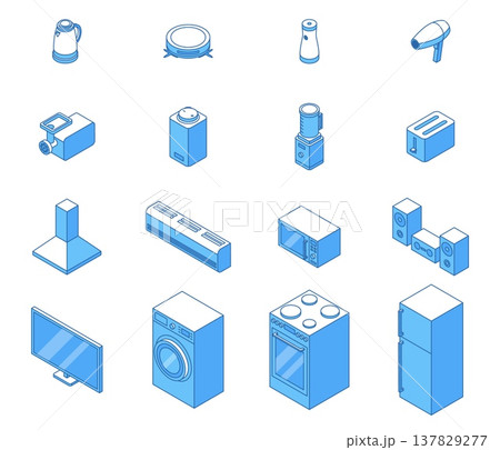 Isometric home appliance. Smart vacuum cleaner, hair dryer, cooler, meat grinder, kettle, washing machine, extractor hood. Electronics nifty vector set