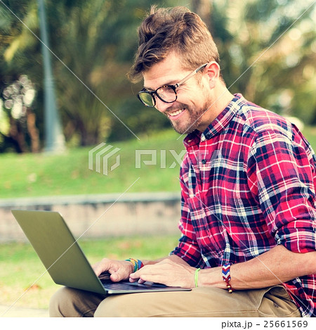 Young Man Smartphone Browsing Laptop Concept.
