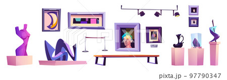 Art gallery visitors looking at paintings, people in museum exhibition. Characters admiring or taking photo of painting or sculpture vector set