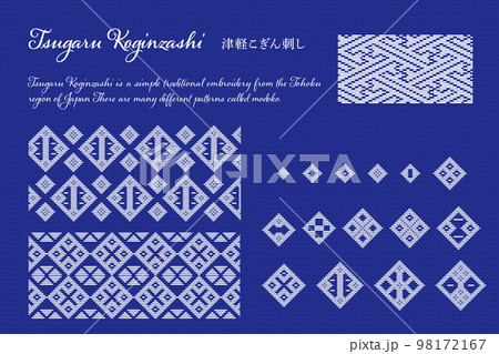 英語の説明文付き 日本の東北地方青森県の伝統刺繍 津軽こぎん刺しのモドコ(模様)