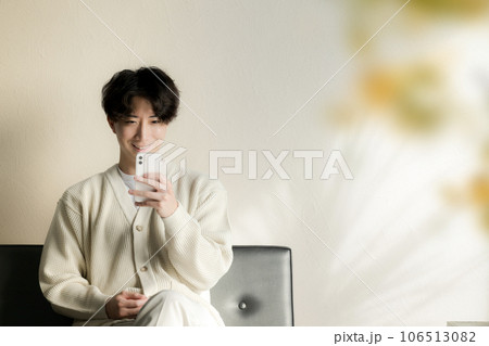 ソファに座ってスマホを見る男性 秋冬葉っぱの前ボケあり