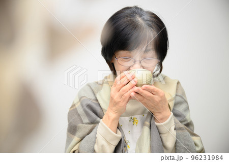 あたたかいお茶を飲んでくつろぐ高齢者 秋冬イメージ