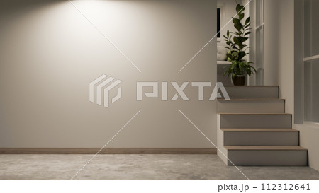 Interior design of a modern, minimalist home corridor with a white wall, stairs, and cement floor.