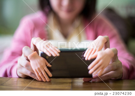 手形の指サックをはめてスマートフォンを操作する女性