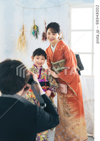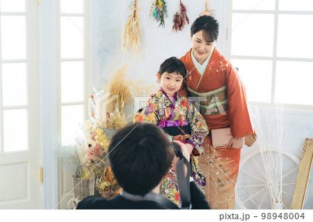 着物を着た親子を撮影するカメラマン 和装の記念撮影 写真館 フォトスタジオ
