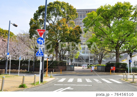 神奈川県藤沢市 日本大学生物資源科学部本館と桜と新緑樹木と横断歩道