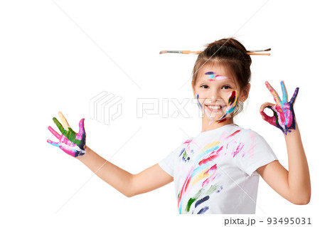 Cute little kid happy girl smile. Cartoon schoolgirl character show facial expression. Vector illustration
