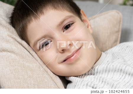 Portrait of a brown-eyed 5-year-old brunette boy lying on a sofa on a pillow and looking at the camera smiling.
