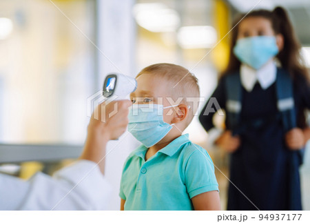 Nurse or doctor checks children body temperature using infrared forehead thermometer for virus.
