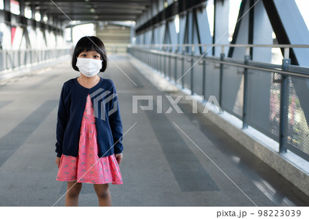 Little girl with surgical mask face protection flu and Virus outbreak in public transportation (skytrain or subway). Concept of New normal lifestyle, Using public transport to travel to school.