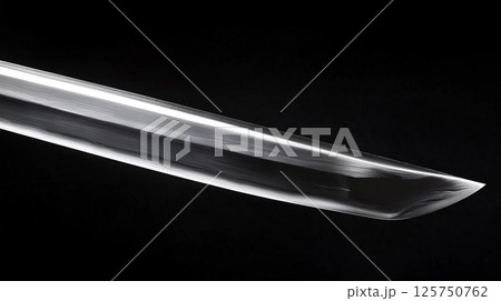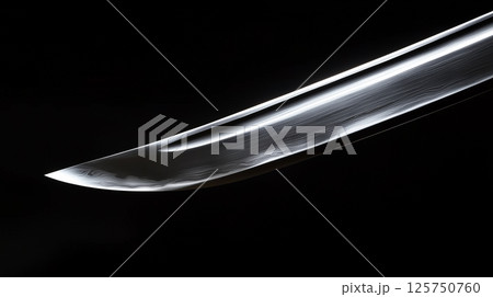日本刀の切っ先。黒色の背景。金属の質感、美しい波紋