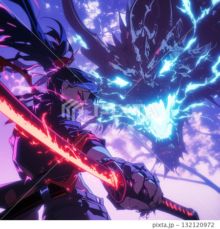 赤く輝く刀を構えた女剣士が、青い雷の龍と対峙する緊迫感あふれる戦闘シーン。