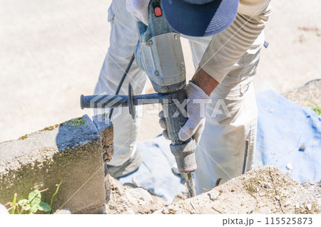 エアーハンマー エアーチッパー エアーチッピングハンマ でコンクリートブロックを崩す作業員エアーハ