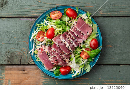 Salad with raw tuna , sesame and cherry tomatoes photography . Top view