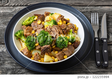 boiled slice braised beef meat with chili in clear tom yum soup on bowl